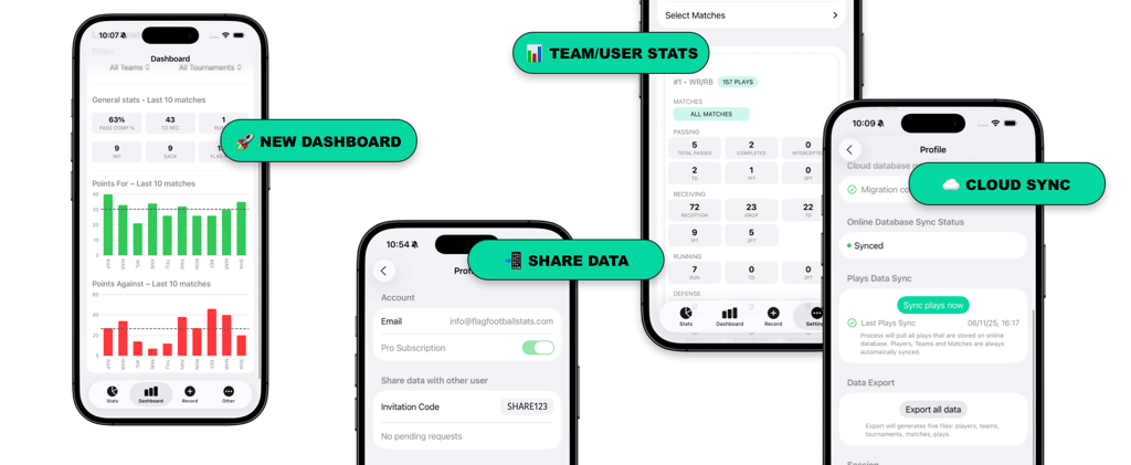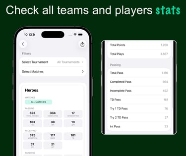 Get a clear picture of your teamâs performance with detailed statistics at your fingertips. Track individual player stats such as touchdowns, interceptions, flag pulls, and more. Analyze team performance trends over time with easy-to-read charts and summaries. Make data-driven decisions to improve your strategy and lead your team to victory!