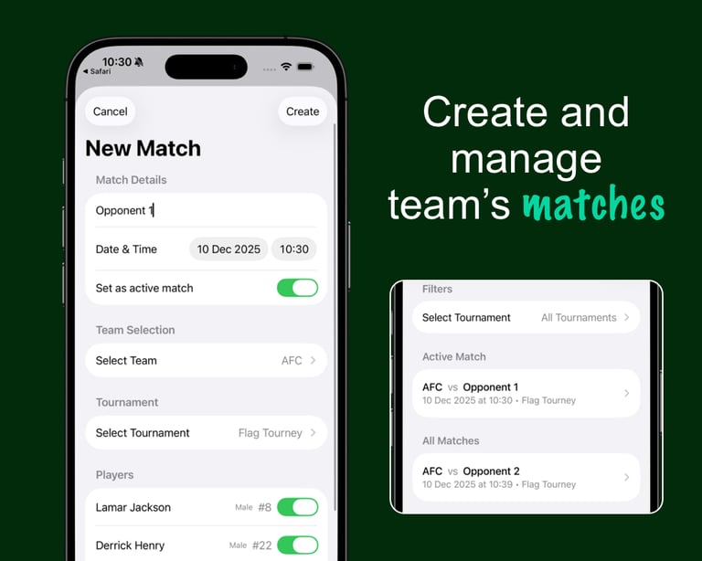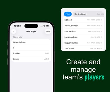Effortlessly set up and manage games with our intuitive interface. Whether itâs a friendly match or a competitive league game, you can create detailed game profiles, including team names, dates, locations, and scores. Keep everything organized in one place and focus on what matters mostâyour teamâs performance on the field.