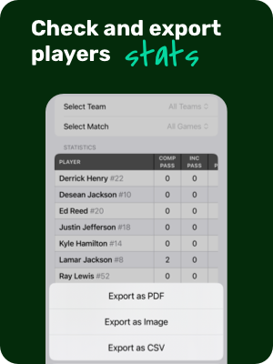 You can track a wide range of stats, including touchdowns, interceptions, flag pulls, passes completed, and more. The app provides both individual player stats and team performance summaries.