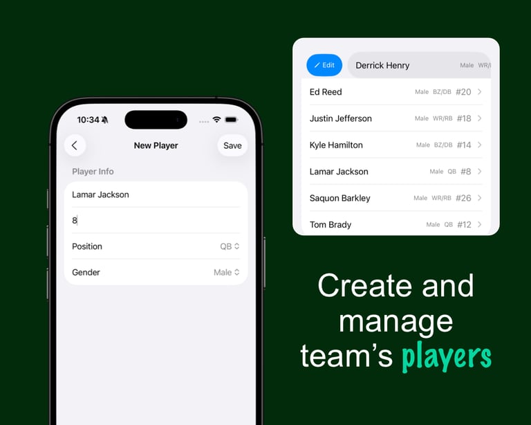 Build your team roster with ease! Add players to your squad, complete with their names, jersey numbers, and positions. Update player information whenever needed to keep your team data accurate and up-to-date. Whether youâre tracking a single team or managing multiple rosters, weâve got you covered.